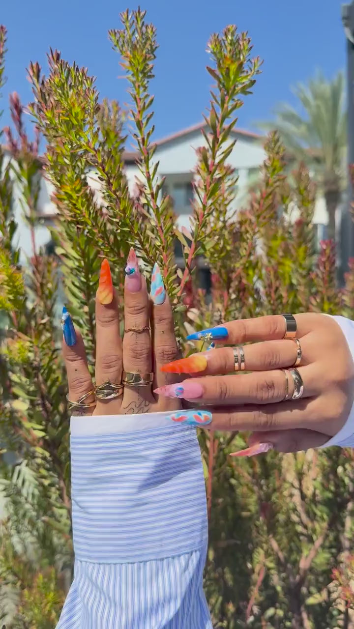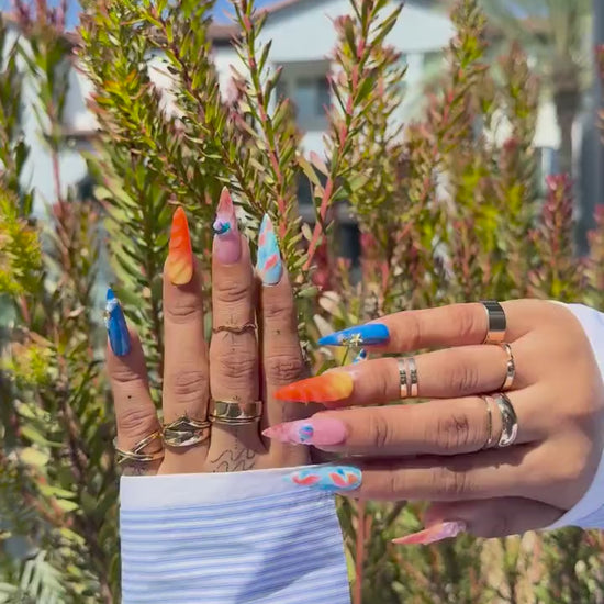 Each nail is carefully handcrafted with raised ocean elements, shimmering shell accents, and soft wave-inspired colours that capture the magic of seaside sunsets. The long stiletto shape adds a bold, elegant finish—ideal for vacations, beach parties, photoshoots, festivals, and summer celebrations. Lightweight yet durable, these nails are made to stand out while feeling comfortable all day.