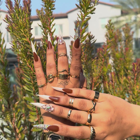 Brown Stiletto Press On Nails | French Tip Nails with 3D Flower & Rhinestones