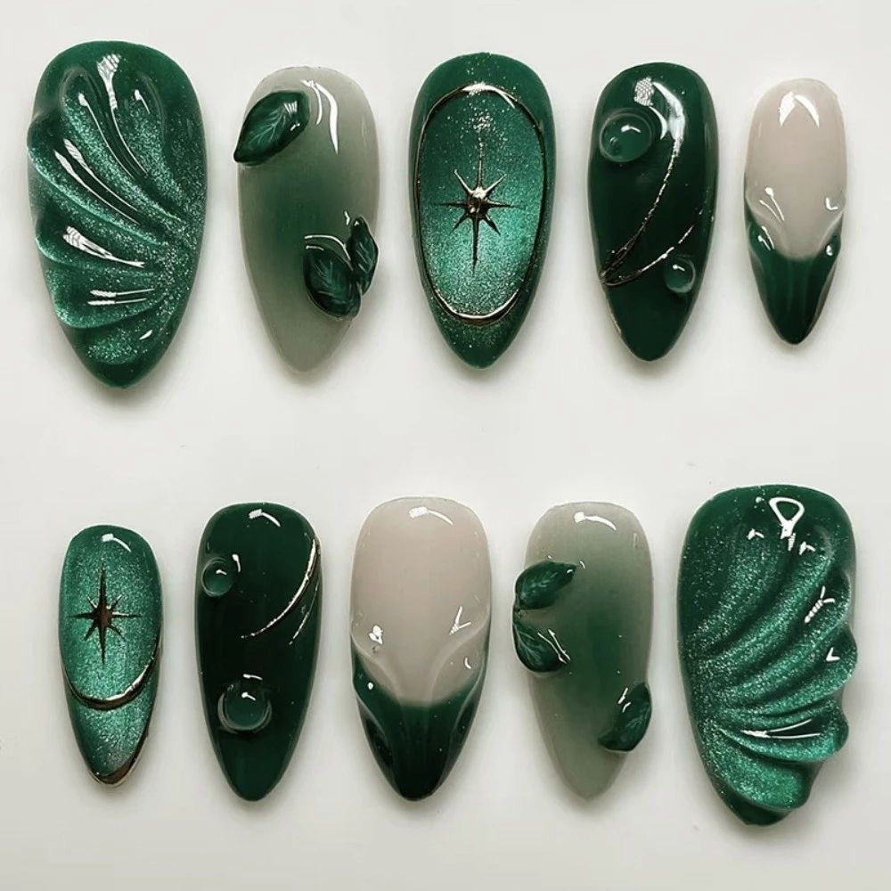Emerald Green Almond Press On Nails | 3D Gel Forest Leaf Nail Art | Handmade Luxury Christmas Fake Nails