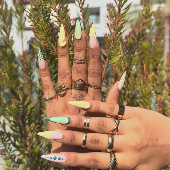 Make a bold style statement with our Green & Yellow Polka Dot Stiletto Press-On Nails, designed for trendsetters who love playful, eye-catching nail art. This vibrant set features a dynamic mix of green and yellow tones with abstract polka dots and geometric patterns, creating a fun yet fashion-forward look.