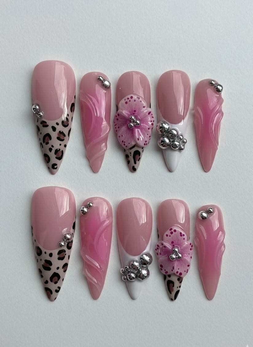 Handmade Pink Stiletto Press On Nails | Leopard Print French Tip Nails | 3D Flower And Silver Pearl Nail Art