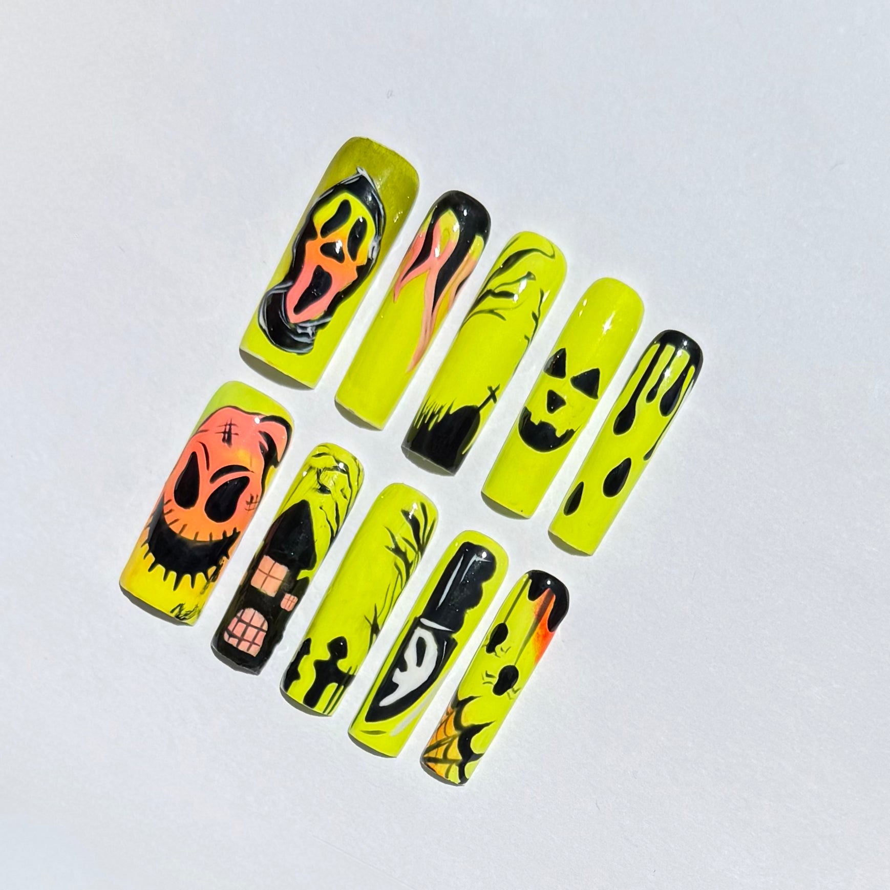 Neon Horror Halloween Press On Nails |Yellow Scary Face And Ghost Design |Spooky Graveyard & Drip,Pumpkin Nail Art