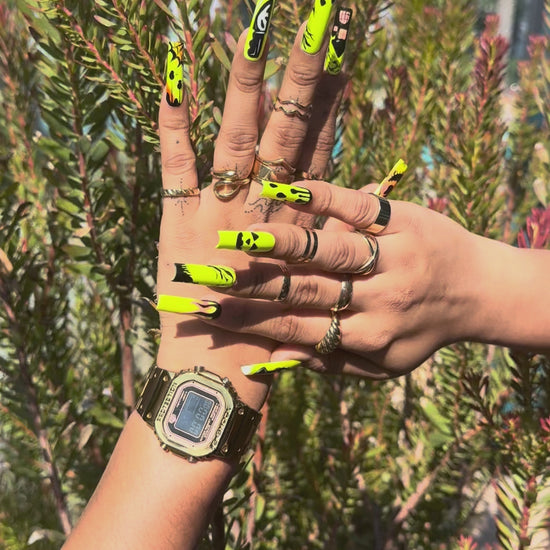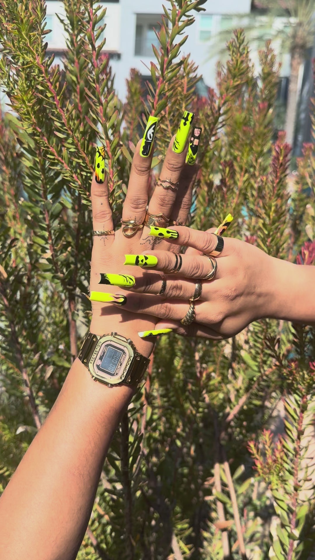 Turn up the terror with our Neon Horror Halloween Press-On Nails, a bold and electrifying set designed for true spooky-season lovers. Featuring vivid neon yellow tones with scary face and ghost illustrations, this nail set is enhanced with eerie graveyard scenes, dripping effects, and pumpkin details for a full-on horror aesthetic.