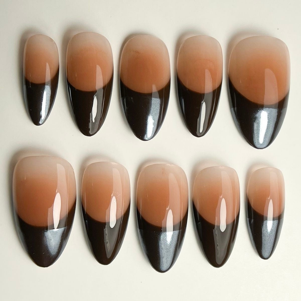 Each nail is carefully handcrafted with a soft nude base that fades into deep black for a modern, classy finish. The almond shape gives a natural, feminine silhouette while the glossy gel-like shine keeps the look polished and professional. Perfect for office wear, casual styling, dinners, and special occasions—these nails are lightweight, comfortable, reusable, and made to match every outfit with understated glam.
