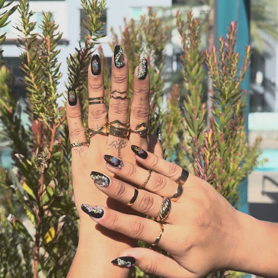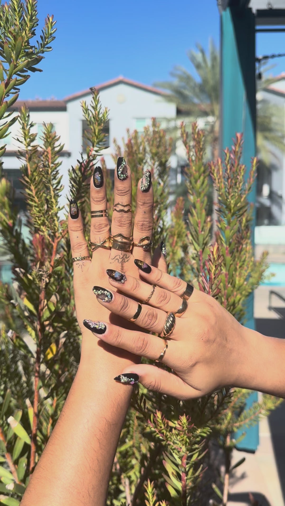 Each nail is carefully handcrafted with a sleek black glossy finish, premium rhinestone heart embellishments, and shimmering gold foil touches that reflect light beautifully. The result is a rich, elegant look that feels glamorous yet classy—perfect for parties, date nights, weddings, birthdays, photoshoots, and special occasions. Lightweight and comfortable, these press-on nails offer durable wear and can be reused with proper care.