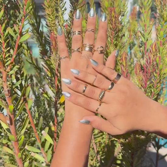 Each nail is carefully handcrafted with a reflective silver chrome coating for a high-shine, salon-quality finish. Lightweight, durable, and reusable, this set brings professional nail art to your fingertips in minutes.