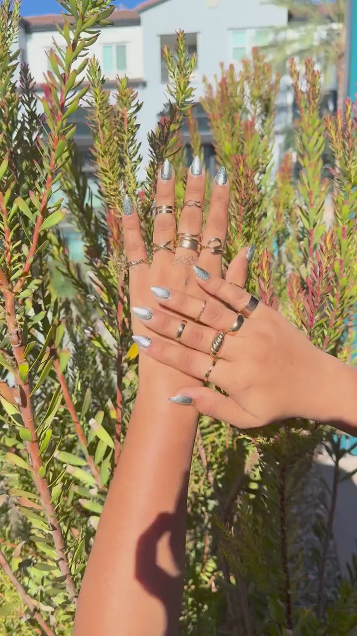 Shine bright with our Silver Chrome Almond Press-On Nails, featuring a stunning metallic mirror finish that adds instant glam to your look. These handmade almond-shaped nails are perfect for parties, special events, or adding a touch of everyday luxury.