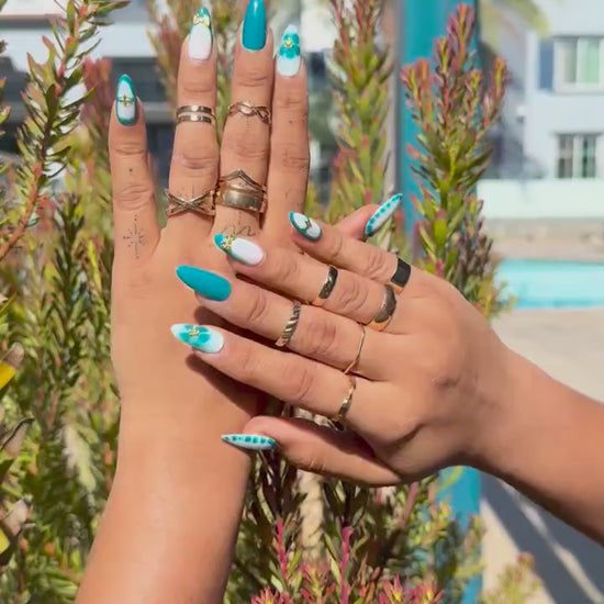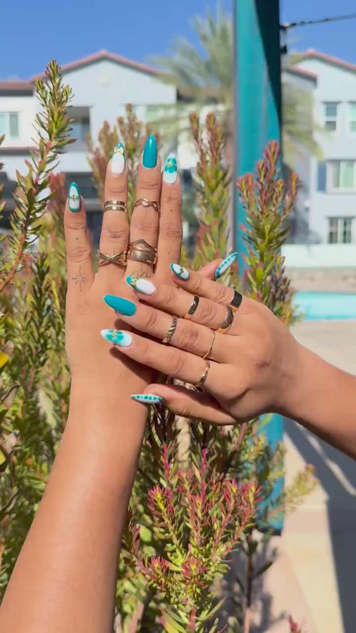 Bring elegance and charm to your fingertips with our Teal Marble Press-On Nails, featuring a stunning handmade marble design in shades of teal, accented with delicate mini bow, star, and pearl flower charms. These long almond-shaped gel nails are perfect for weddings, special events, or any occasion where you want a sophisticated and whimsical manicure.